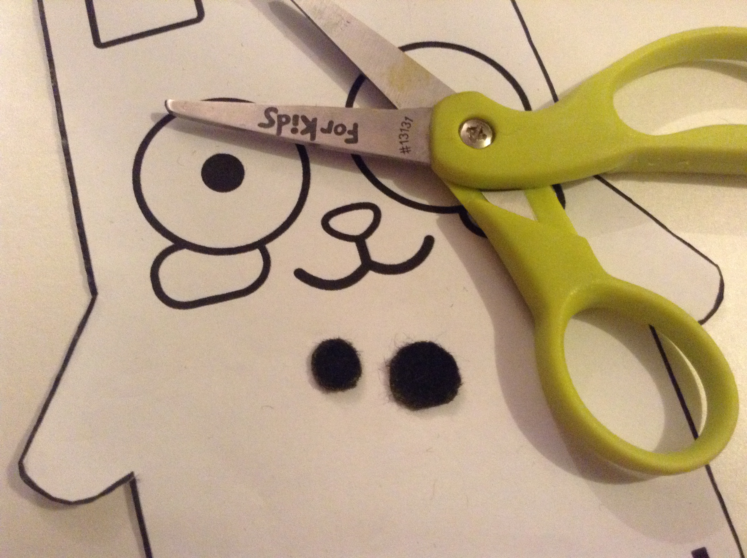 Cut out the Freezer Bunny shape, follow the black line. Also cut out both eyes (as they are a different size), both pupils, an ear, a cheek and if you don't have a proper black nose and are going to use felt for this, also cut out the nose.