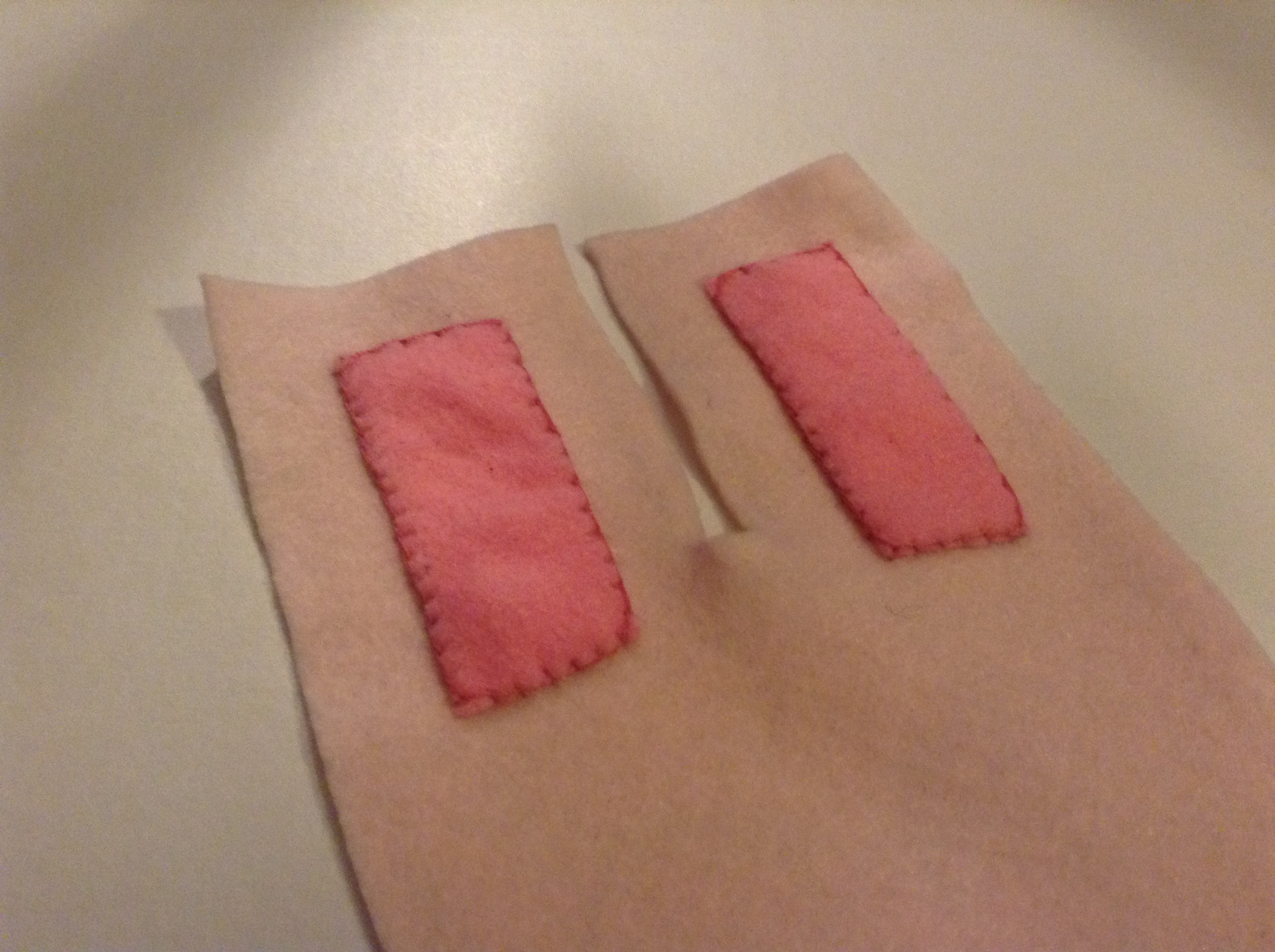 I have a medium pink thread I am going to use to sew the ears onto the bunny. I am making sure to assemble all the small parts to the front first. And I'm starting with the ears.