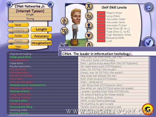 SimGolfMore importantly, SimGolf is loads of fun. Anyone who writes anything in the game industry--editors like me, developers who write columns or designer diaries, and everyone else--will go on and on about how easy it is to get bogged down developing different aspects of games and lose sight of making games fun to play. But SimGolf actually delivers in this regard. Despite its many minor problems, it's lots of fun. Honest-to-goodness fun. The game's course-building component is simple and remarkably engaging, and the process of designing a course for your little computer people using the game's colorful landscaping tools is interesting--it's especially rewarding when the golfers on your course play through it as you intended. And though some golf purists might disagree, I believe that SimGolf's golfing component strips away just about everything that a non-purist might find to be tedious about golf. You don't manually choose your clubs or worry about wind factor, and you can select the power you want to put behind your strokes with a simple mouse-driven approximation that doesn't require you to scrutinize your swing down to the last pixel. And even though SimGolf is great for spending a relaxing afternoon building the perfect golf course, it's just as good for a quick diversion--not just for building a quick nine-hole course (which can take as little as 10-15 minutes), but also for its tournament mode, which lets your golfer compete for prize money on any course you've already made.