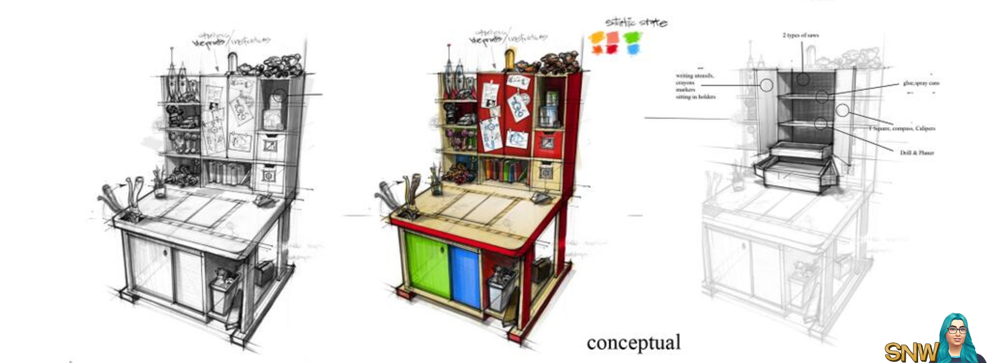 Lately the Sims Studio has been sharing a lot of cool concept arts of The Sims 2 and The Sims 3. Today The Sims 3 on Twitter shared how the toy workbench from The Sims 2: Open for Business was created. In 6 steps with images: