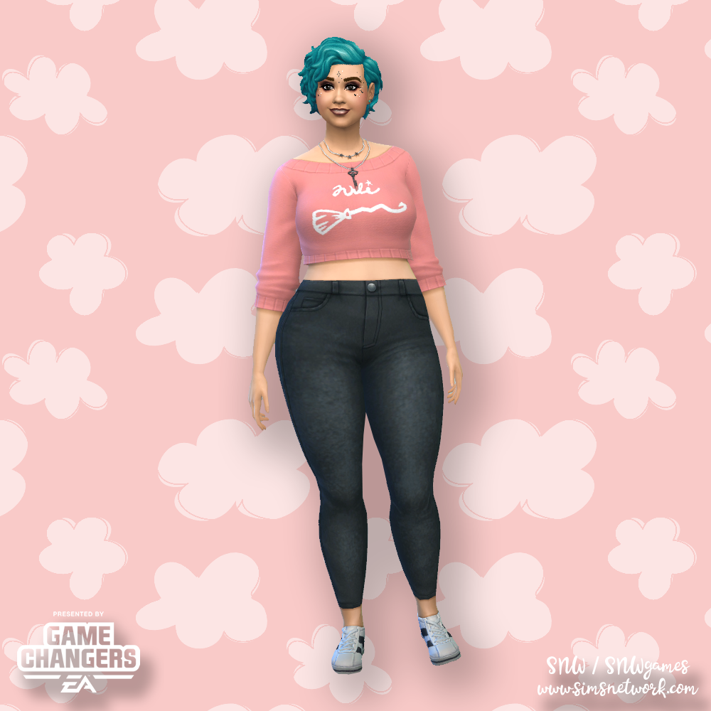 How cute is that crop top? There are a few more of these with different prints as well, including but not limited to a cartoony black cat! Rosie is wearing a high waisted skinny jeans, and regular white sneakers to complete the outfit. Her hair style is new as well. It's actually not available by default for feminine Sims, but luckily we can just disable that filter and pick any hair we like! Cause let's be honest, doesn't this hairdo look cute?